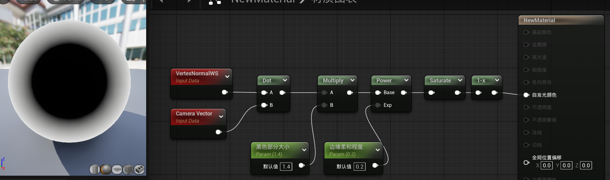 用物体的顶点法线与摄像机向量进行点乘。点乘运算可以获取两个向量之间的夹角。因为摄像机向量设置指向摄像机,所以当顶点法线与我们的视线垂直时(也就是顶点法线与摄像机向量夹角为0度时),该点的值为1,当顶点法线与摄像机向量夹角为90度时,该点的值为0。材质里预览使用的模型为一个球型,所以从我们视角里看到的圆的圆心为1,边缘为0。然后为了使我们能够调节这个效果,我们可以乘以一个数值,这个数值决定着中间白色区域(靠近1的区域)的大小。使用power(由于power乘方运算的特点,power可以用于调节对比度)节点可以调节黑色区域与白色区域的过度。当数值越接近0时,过度越柔和,当数值越大时,过度越坚硬。最后用saturate将数值钳制在0到1之间,再用1-x使黑白反向,就形成上图的效果。
