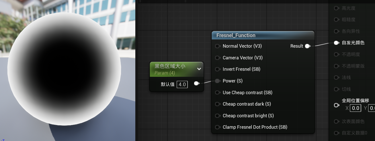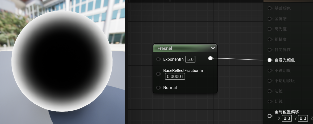 ExponentIn对应我们制作的简单菲涅尔效果的黑色部分大小,BaseReflectFractionIn是黑与白之间的过度效果。