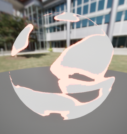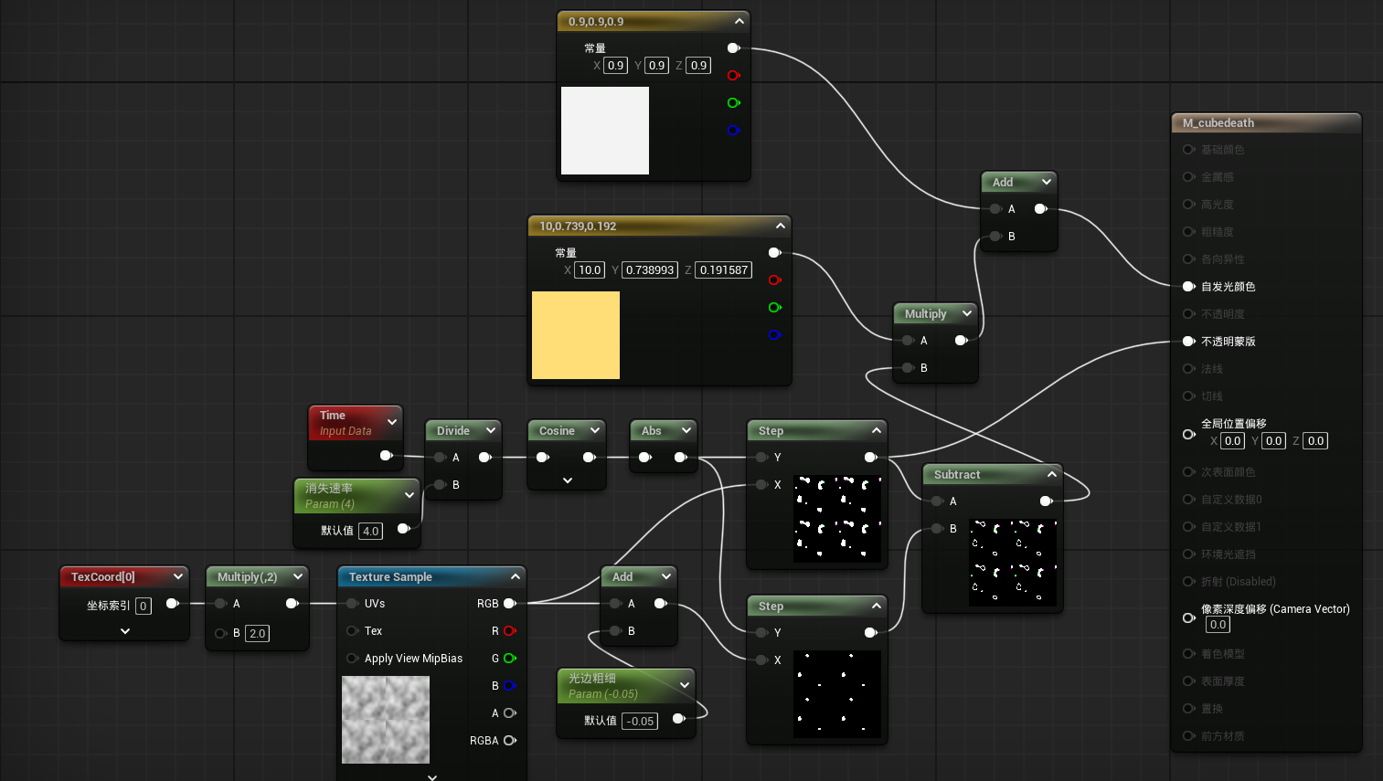 首先创建一个材质,混合模式改为已遮罩,光照模式改为无光照。找一张噪声图连接到step的x。time节点会随时间逐渐增长,连接到cosine后值会像余弦函数那样从1到-1之间逐渐变,使用abs绝对值将值变为1到0之间。然后连接到step的y节点。余弦函数的值在0到1之间逐渐变化,当图片中的该点的值大于余弦函数的值时最终值为1,小于时为0。这样就做出了动态的溶解效果,连接到不透明蒙版。我们让图片的值整体减去一个数,再连接一个step,这个step变化就会比刚才的step快一些。用上面的step减下面的step就会获得一个光边效果,让光边乘一个颜色再加上原有颜色连接到自发光颜色就能出现整体效果了。