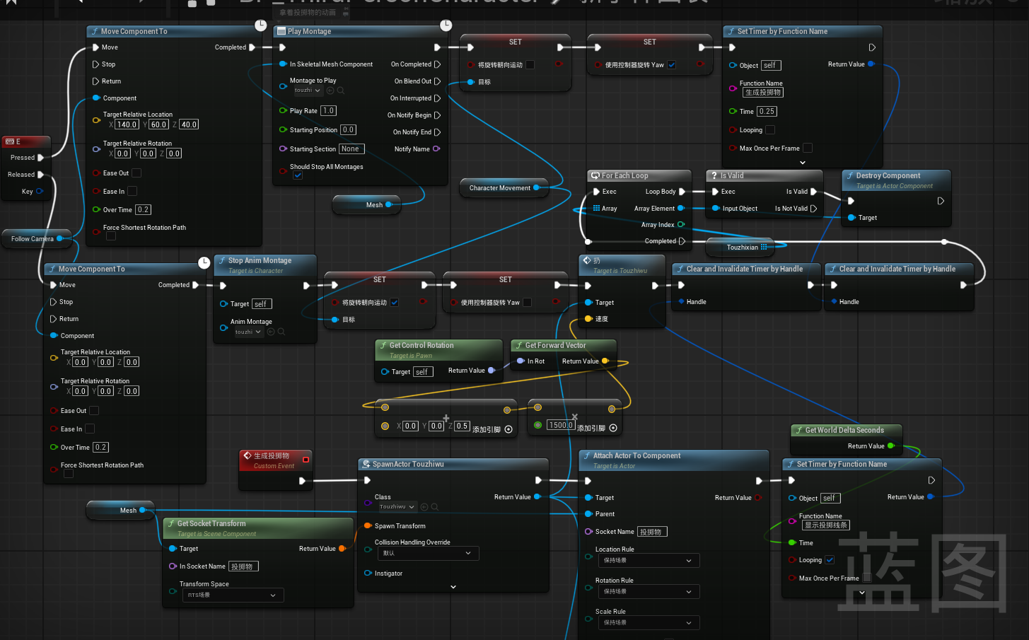 按下按钮E进入投掷状态。首先应该移动摄像机位置,将正背后的摄像机移动到靠近肩部。然后播放抬手动画,并且将旋转朝向运动关闭(关闭掉此项功能后角色朝向就不受角色的运动方向影响)、使用控制器旋转打开(打开后鼠标移动就能使视角旋转)。因为抬手动画的混入时间大概0.25秒,所以延迟0.25秒生成投掷物与样条线。