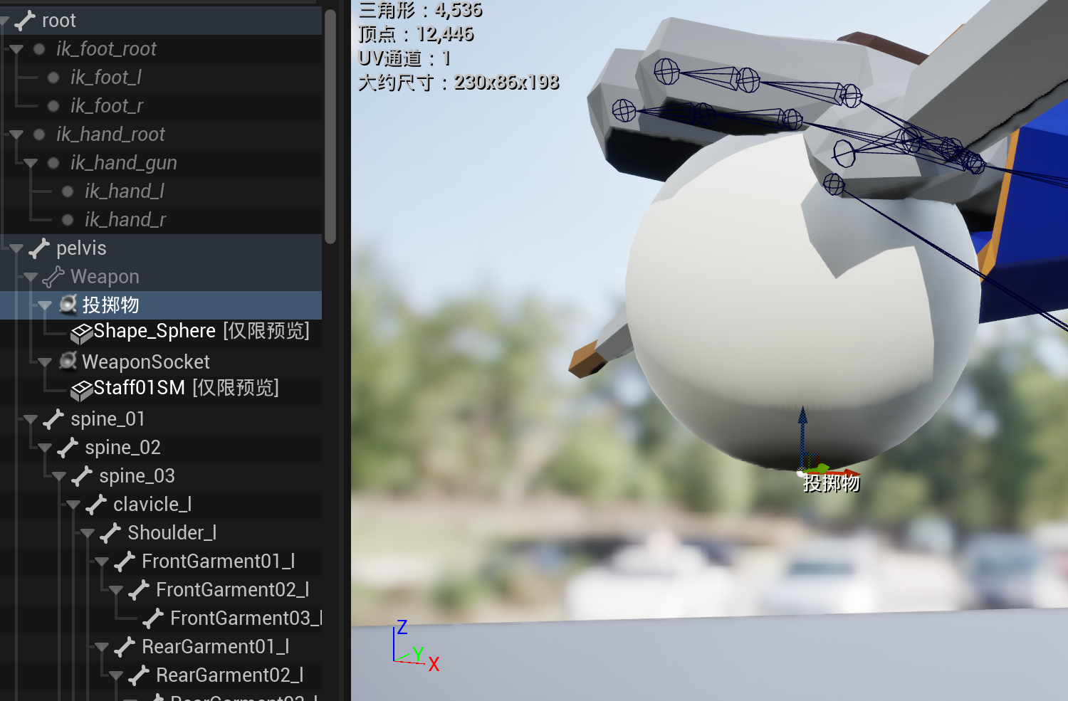 接下来就是生成投掷物事件。首先打开角色的骨骼文件,在合适的位置添加一个插槽,并把投掷物的静态网格体添加到预览里,调整插槽的变化,使投掷物插槽在一个合适的位置。