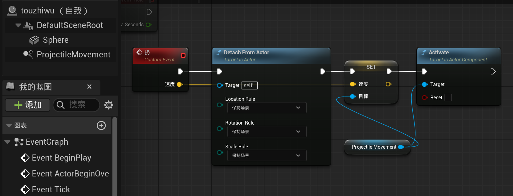 新建一个蓝图类,将投掷物的网格体拖进来,再添加一个组件:ProjectileMovement(发射物移动组件)。发射物移动组件是用来做抛物线或者子弹的组件。添加之后我们需要把激活里的自动启动给关掉,因为我们需要扔出去的时候再让发射物进行移动。接下来添加一个自定义事件。让该actor能够自由移动需要先将它从父类中移除。这三个规则仍然的保持场景。然后给与该actor一个初始速度,最后激活发射物移动组件。初始速度与角色的速度有关,所以把它连到事件的输入里。