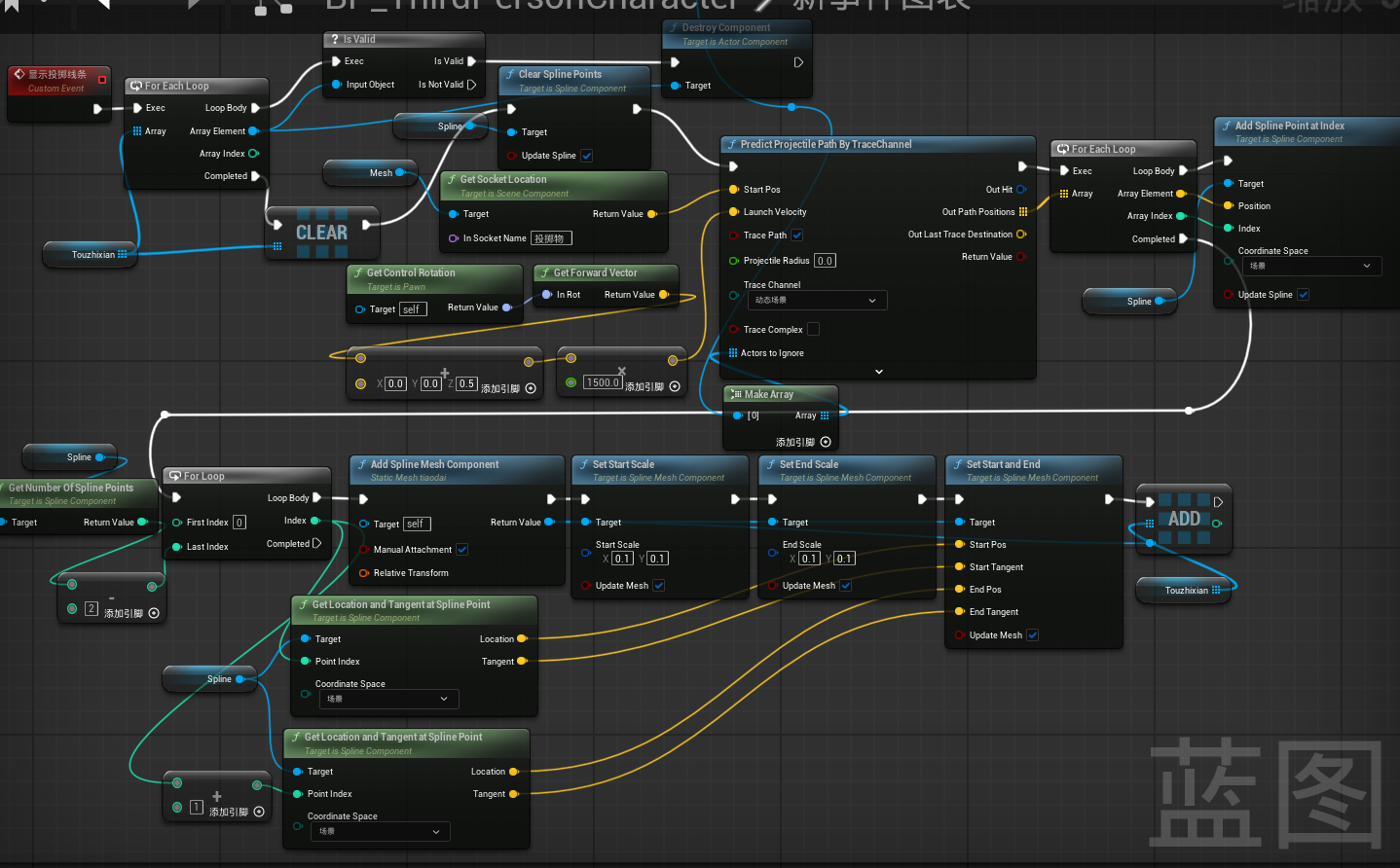 要使用样条线,需要先添加一个组件:Spline 样条组。样条线需要每帧更新,所以我们先销毁里面的所有actor并清空数组,再清除样条组件里的样条点。然后就是生成样条线的部分了。要生成样条线需要生成样条点,再在样条点处生成样条网格体组件,样条网格体组件就是我们能够看到的样条线。