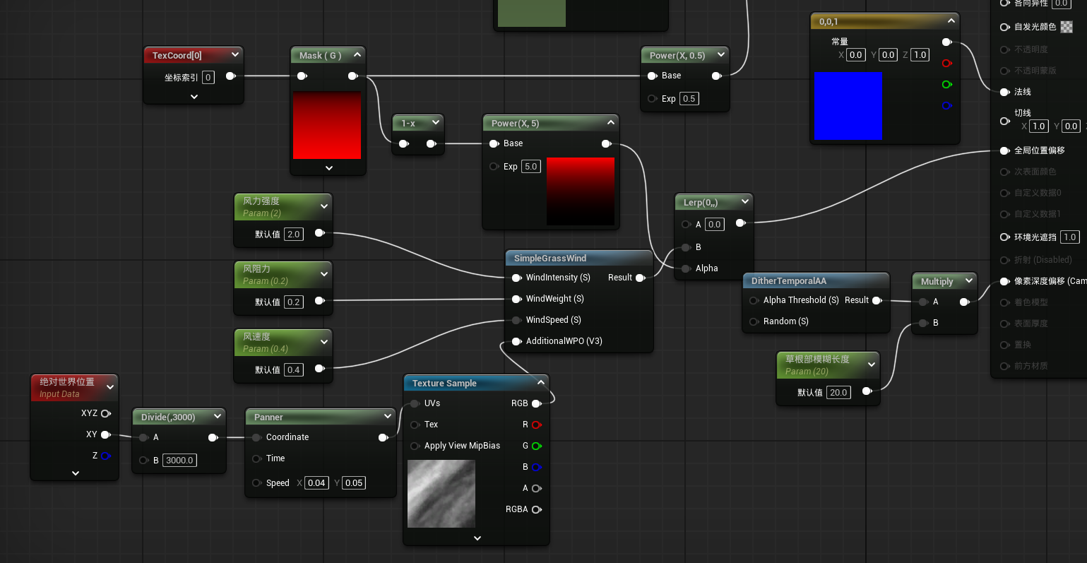 这样的风力效果是所有草都会有,如果我们想做风时有时无,吹过草地的效果,我们可以使用一张蒙版贴图,再对贴图进行移动就可以了。导入贴图,因为草铺在世界中,所以我们用WorldPosition绝对世界位置连接到图片的uv。绝对世界位置是一个较大的数,我们可以除以一个较大的数来使效果更明显。使用Panner移动节点就可以使图片移动了,speed引脚里的数值就是移动的方向与速度。最后将蒙版连接到附加权重里就可以了。
