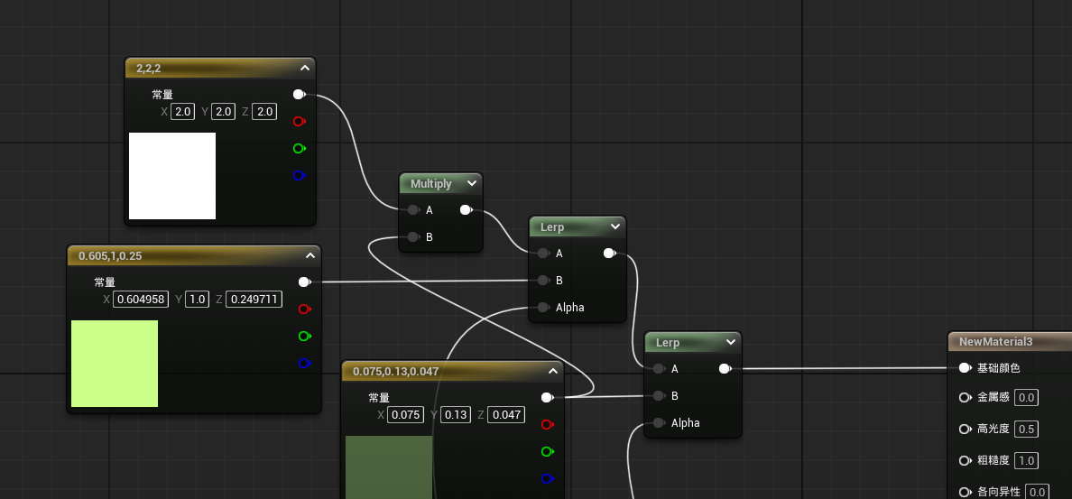 我们找到原来改变草尖颜色的部分。我们让另一个颜色与原来草尖颜色进行lerp混和,Alpha是我们风动的那张蒙版图。A连接无风时草尖的颜色,B连接有风时草尖的颜色。因为我们只想让草尖的颜色改变,所以在草根与草尖的lerp前进行lerp。