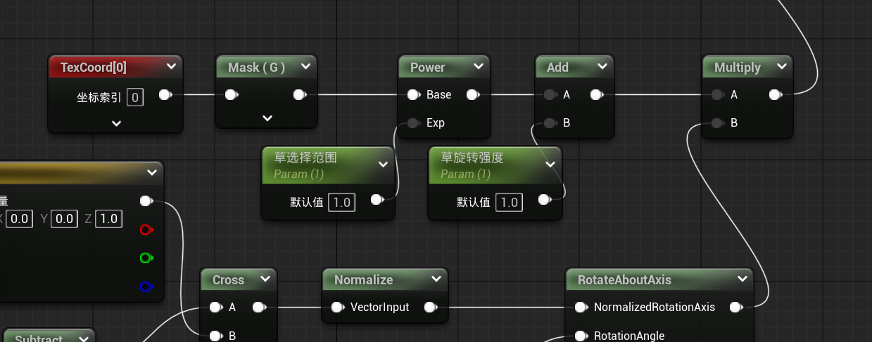 如果这样直接连上全局位置偏移,那么会发整根草都会有旋转效果,而我们之前需要让草的上部旋转,所以需要一个遮罩乘以绕轴旋转。遮罩的思路参考风部分的遮罩思路。最后让乘后的值加上风,连接到全局位置偏移,就能实现风与倒塌的叠加。