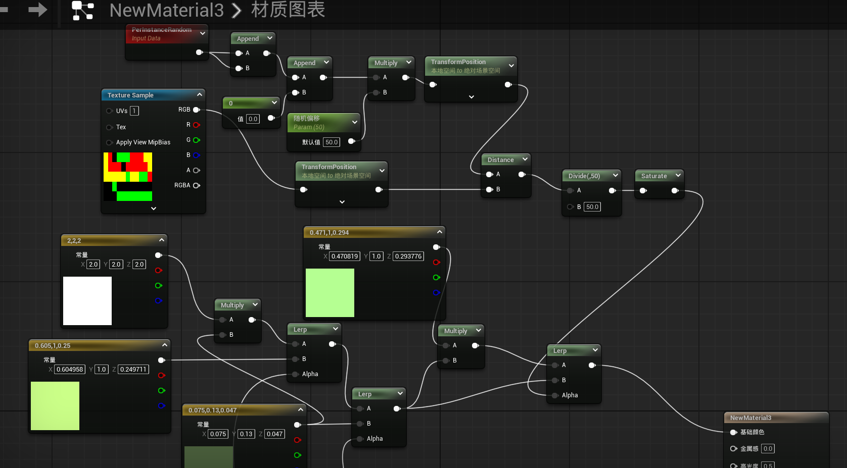我们需要创建一个从上到下渐变的蒙版。Mask节点可以用来提取通道,但其本身又是一个带渐变的蒙版,点击节点右上方的箭头就可以展开。当选择G通道时,就是一个由上到下逐渐变化的蒙版。我们将他通过power节点改变其效果,当乘方的数为小数时会增加红色的区域,也就是更接近为1的区域,乘方的数大于1会增加黑色的区域,也就是接近0的区域。我们将原来的颜色乘以三维向量(2,2,2),这样可以使颜色变得更鲜亮,将乘后的材质与原材质用lerp混合,连接到基础颜色。