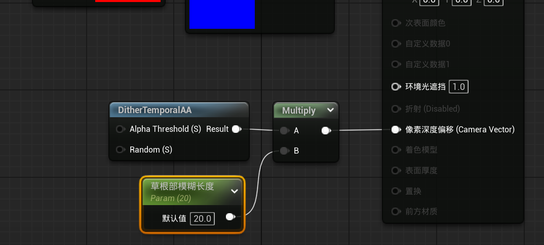使用DitherTemporalAA节点,再乘一个数,连接到像素深度偏移,乘的数值可以控制根部过度的长度。